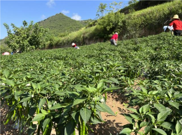 迎來了辣椒、豇豆、黃瓜、茄子等各類蔬菜的上市季。在縣鄉壩梅村辣椒栽培基地,田間地頭生氣勃勃、綠意盎然,壹個個青翠新鮮的辣椒綴滿枝頭,壩梅村村莊經紀人尹熊飛與鄉民們穿梭於辣椒地裏忙著採摘、搬運、稱重、打包、裝車,忙得不亦樂乎。